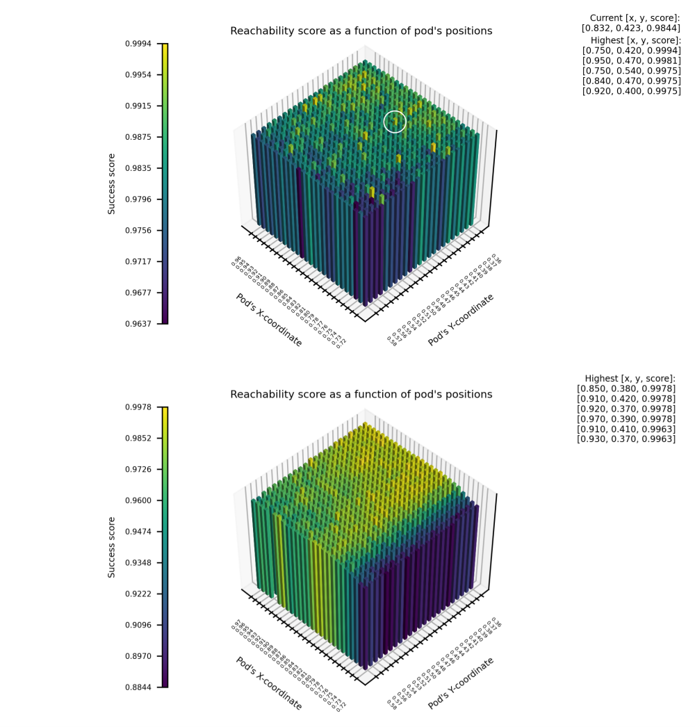 Overall, I came up with analysis of 800 pod poses (400 for each of two pods, with 1 cm step in x,y), and showed that the reachability failure could be improved from 20/1600 to 1/1600.