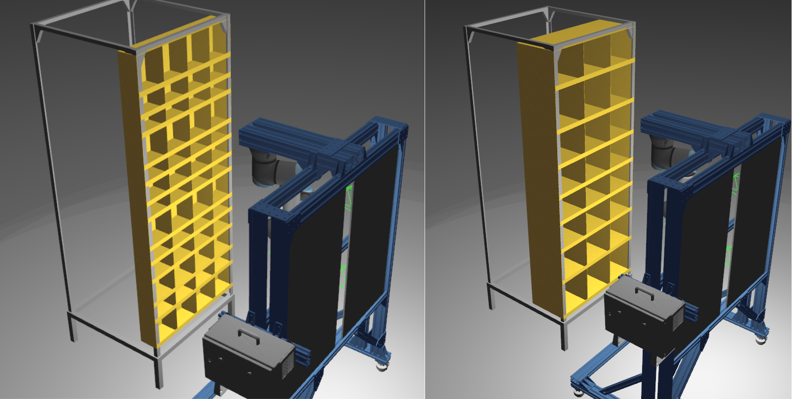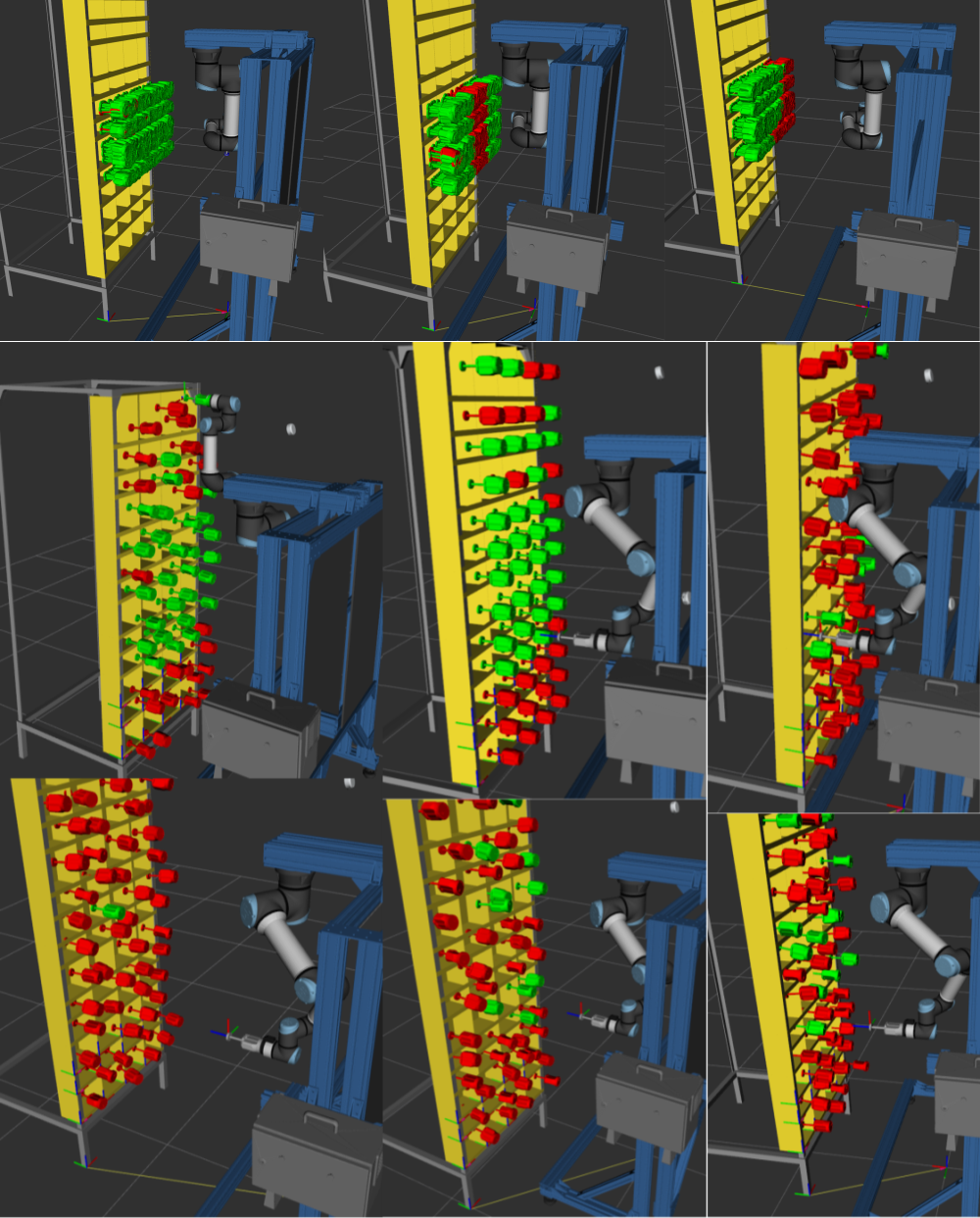To find an optimal pod position relative to the robot workstation, I tested the robot’s reachability, i.e. moving the end-effector from the home pose (item dropping point) to a pre-grasp pose (one random pose in front of the given bin).