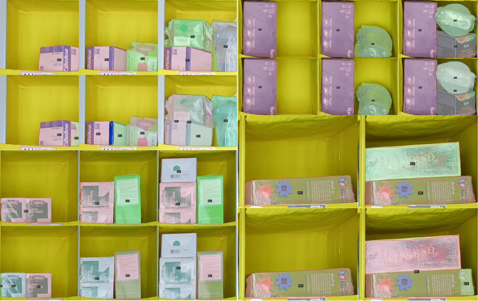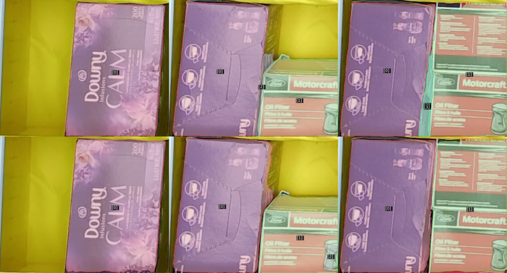 Also, as the new model is trained in highly packed bins where thin objects like towels/napkins are placed vertically because of optimality (which is computed according to object vs bin bounding boxes similarity mentioned above) to store and pick, it might oversegment in such scenarios.
