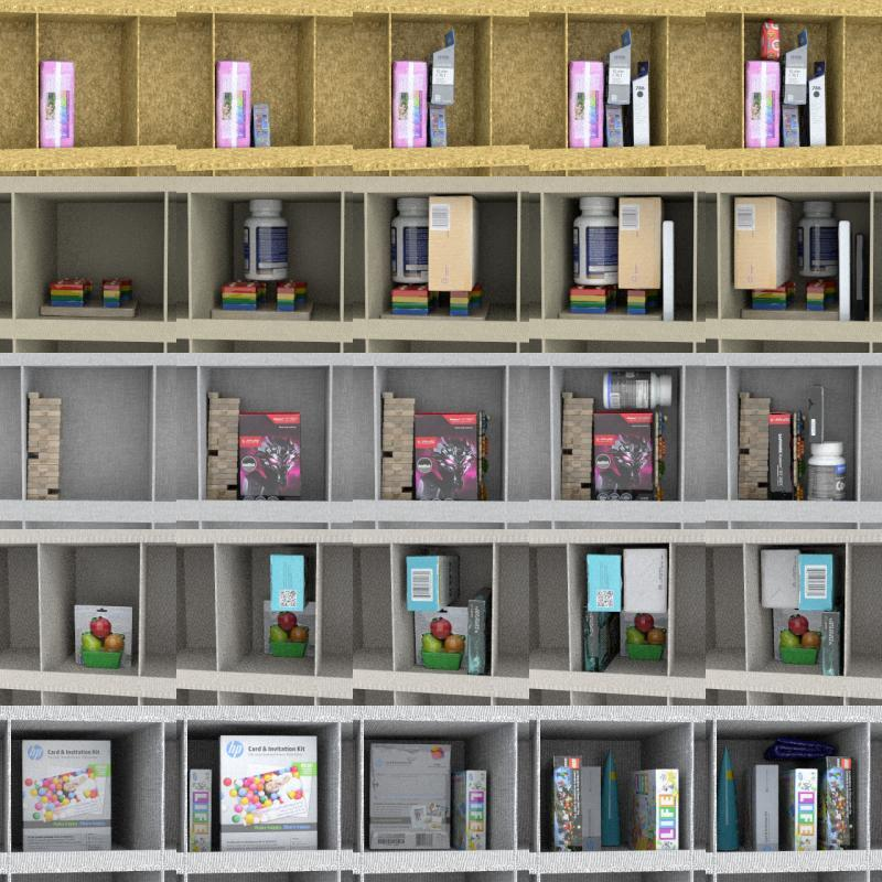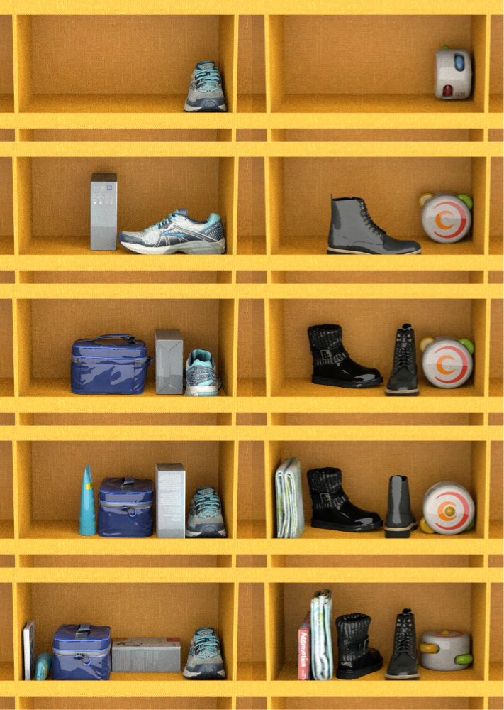 - objects relative placement (w/ & w/o stacking, partial/full occlusion, shuffled order)